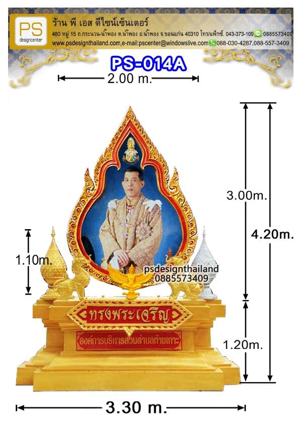 รหัสสินค้า:PS-014A ซุ้มเฉลิมพระเกียรติ ไฟเบอร์กลาส ขนาด 3.30 x 4.20 เมตร. ประกอบด้วย *กรอบรูปไฟเบอร์กลาส ลายหยดน้ำ ขนาด 2.00 x 3.05 เมตร. *พระบรมฉายาลักษณ์พิมพ์ไวนิล ขนาด 1.50 x 2.20 เมตร. *ครุฑไฟเบอร์กลาสขนาด 0.60 เมตร. *ป้ายทรงพระเจริญไฟเบอร์กลาส ขนาด 0.45 x 1.80 เมตร. *ป้ายชื่อหน่วยงาน สติกเกอร์บนแผ่นเหล็กซิงค์ ขนาด .................... เมตร *พานพุ่ม ไฟเบอร์กลาส เงิน-ทอง ขนาด 1.10 เมตร. *ฐานรองกรอบไฟเบอร์กลาส ขนาด 1.20 x 3.30 เมตร. *โครงเหล็กค้ำยันด้านหลัง สนใจติดต่อ 088-557-3409(คุณก้อย) ID LINE:0885573409 Email:pscenter@windowslive.com ขอใบเสนอราคา สำหรับผู้รับเหมาราคาพิเศษค่ะ เข้าชมผลงาน เราได้ที่เพจ https://www.facebook.com/PS-Design-Center-1495745454044165/ |