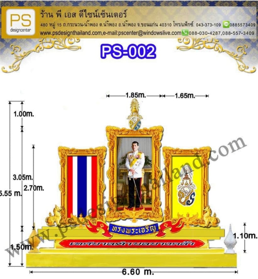 รหัสสินค้า : PS-002 ซุ้มเฉลิมพระเกียรติ ขนาด 6.60 x 5.55 เมตร. ประกอบด้วย *กรอบรูปไฟเบอร์กลาส (กลาง) ขนาด 1.85 x 3.05 เมตร. *พระบรมฉายาลักษณ์ พิมพ์ไวนิล (กลาง) ขนาด 1.20 x 2.40 เมตร. *ตราสัญลักษณ์ วปร.(กลาง) ขนาด 1.00 เมตร. *กรอบรูปไฟเบอร์กลาส (ซ้าย-ขวา) ขนาด 1.65 x 2.70 เมตร. *ธงชาติ / ตราประจำพระองค์ พิมพ์ไวนิล (ซ้าย-ขวา) ขนาด 1.00 x 2.00 เมตร. *ครุฑไฟเบอร์กลาส ขนาด 0.60 เมตร. *คชสิงห์ 1 คู่ ขนาด 0.55 x 0.70 เมตร *ป้ายทรงพระเจริญไฟเบอร์กลาส ขนาด 0.38 x 3.80 เมตร. *ป้ายชื่อหน่วยงาน อักษรสติ๊กเกอร์ติดบนแผ่นซิ้งค์ ขนาด 0.40 x 1.80 เมตร *พานพุ่ม ไฟเบอร์กลาส เงิน-ทอง ขนาด 1.10 เมตร. *ฐานรองกรอบรูป แผ่นเหล็กซิงค์ ขนาด 1.50 x 6.60 เมตร. *โครงเหล็กค้ำยันด้านหลัง สนใจติดต่อ 088-557-3409(คุณก้อย) ID LINE:0885573409 Email:pscenter@windowslive.com ขอใบเสนอราคา สำหรับผู้รับเหมาราคาพิเศษค่ะ เข้าชมผลงาน เราได้ที่เพจ https://www.facebook.com/PS-Design-Center-1495745454044165/ |