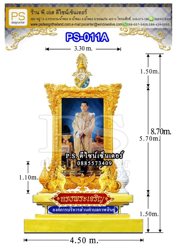 รหัสสินค้า:PS-011A ซุ้มเฉลิมพระเกียรติไฟเบอร์กลาส ขนาด 4.50 x 8.70 เมตร. ประกอบด้วย *กรอบรูปไฟเบอร์กลาส ขนาด 3.30 x 5.70 เมตร. *พระบรมฉายาลักษณ์พิมพ์ไวนิล ขนาด 2.40 x 4.80 เมตร. *ตราสัญลักษณ์ไฟเบอร์กลาสขนาด 1.50 เมตร. *คชสิงห์ 1 คู่ ขนาด 0.55 x 0.70 เมตร. *ครุฑไฟเบอร์กลาส ขนาด 0.60 เมตร. *ป้ายทรงพระเจริญไฟเบอร์กลาส ขนาด 0.45 x 1.80 เมตร. *ป้ายชื่อหน่วยงาน ติดสติกเกอร์บนแผ่นซิงค์ ขนาด ...................... เมตร *พานพุ่ม ไฟเบอร์กลาส เงิน-ทอง ขนาด 1.10 เมตร. *ฐานรองกรอบทำจากเหล็กซิงค์ขนาด 1.50 x 4.50 เมตร. *โครงเหล็กค้ำยันด้านหลัง สนใจติดต่อ 088-557-3409(คุณก้อย) ID LINE:0885573409 Email:pscenter@windowslive.com ขอใบเสนอราคา สำหรับผู้รับเหมาราคาพิเศษค่ะ เข้าชมผลงาน เราได้ที่เพจ https://www.facebook.com/PS-Design-Center-1495745454044165/ |