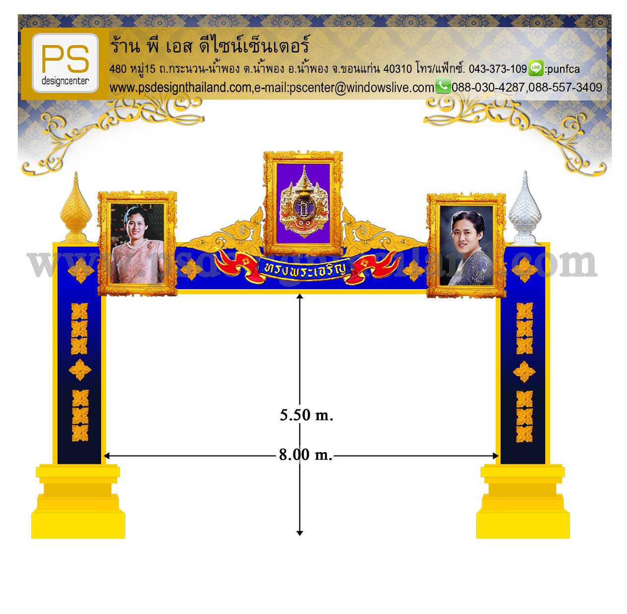 ซุ้มคร่อมเฉลิมพระเกียรติ ราคา 390,000.- บาท **ขนาดปรับเปลี่ยนได้ตามความเหมาะสม สำหรับท่านที่แนะนำลูกค้าให้มีค่าตอบแทนสูง.. สนใจติดต่อ 088-557-3409(คุณก้อย) ID LINE:0885573409 086-424-5955(คุณปุณ) Email:pscenter@windowslive.com ขอใบเสนอราคา สำหรับผู้รับเหมาราคาพิเศษค่ะ ยินดีรับทุกเงื่อนไข เข้าชมผลงาน เราได้ที่เพจ https://www.facebook.com/PS-Design-Center-1495745454044165/ หรือค้นหาเพจ facebook:ซุ้มเฉลิมพระเกียรติP.S.Design Center |