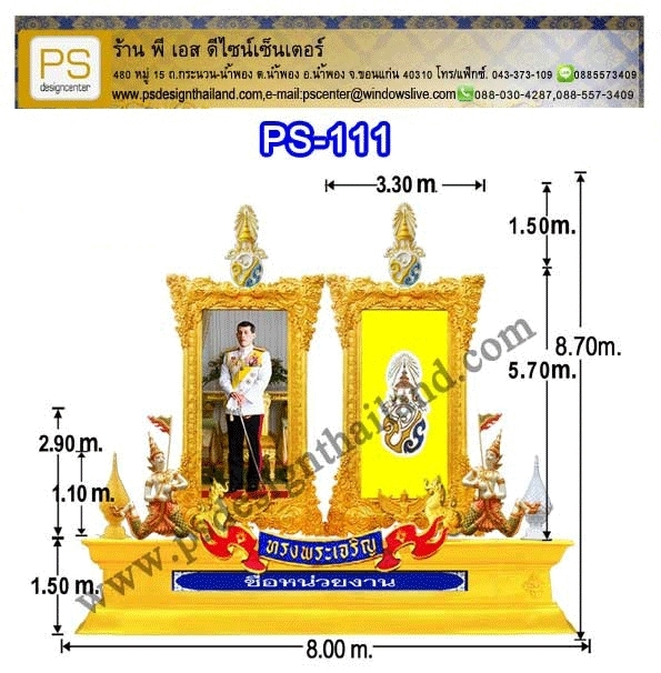 รหัสสินค้า PS-111 ซุ้มเฉลิมพระเกียรติ ขนาดรวม กว้าง8.00 x สูง8.70 เมตร. ประกอบด้วย *กรอบรูปไฟเบอร์กลาส ขนาด 3.30 x 5.70 เมตร. *ใส่รูป ในหลวง พิมพ์ไวนิล ขนาด 2.40 x 4.80 เมตร. *ตราสัญญลักษณ์ วปร. ขนาด 1.50 เมตร. *ครุฑไฟเบอร์กลาส ขนาด 0.60 เมตร. *ป้ายทรงพระเจริญลายโบไฟเบอร์กลาส ขนาด 0.38 x 3.80 เมตร. *ป้ายชื่อหน่วยงาน สติกเกอร์บนแผ่นซิงค์ ขนาด .................................. เมตร. *คชสิงห์ ขนาด 0.50 x 0.60 เมตร *เทวดาไฟเบอร์กลาส ขนาด 2.90 เมตร *พานพุ่มไฟเบอร์กลาส เงิน-ทอง ขนาด 1.10 เมตร. *ฐานรองกรอบไฟเบอร์กลาส ขนาด 1.50 x 8.00 เมตร. *โครงเหล็กค้ำยันด้านหลัง สนใจติดต่อ 088-557-3409(คุณก้อย) ID LINE:0885573409 086-424-5955(คุณปุณ) Email:pscenter@windowslive.com ขอใบเสนอราคา สำหรับผู้รับเหมาราคาพิเศษค่ะ ยินดีรับทุกเงื่อนไข เข้าชมผลงาน เราได้ที่เพจ https://www.facebook.com/PS-Design-Center-1495745454044165/ |