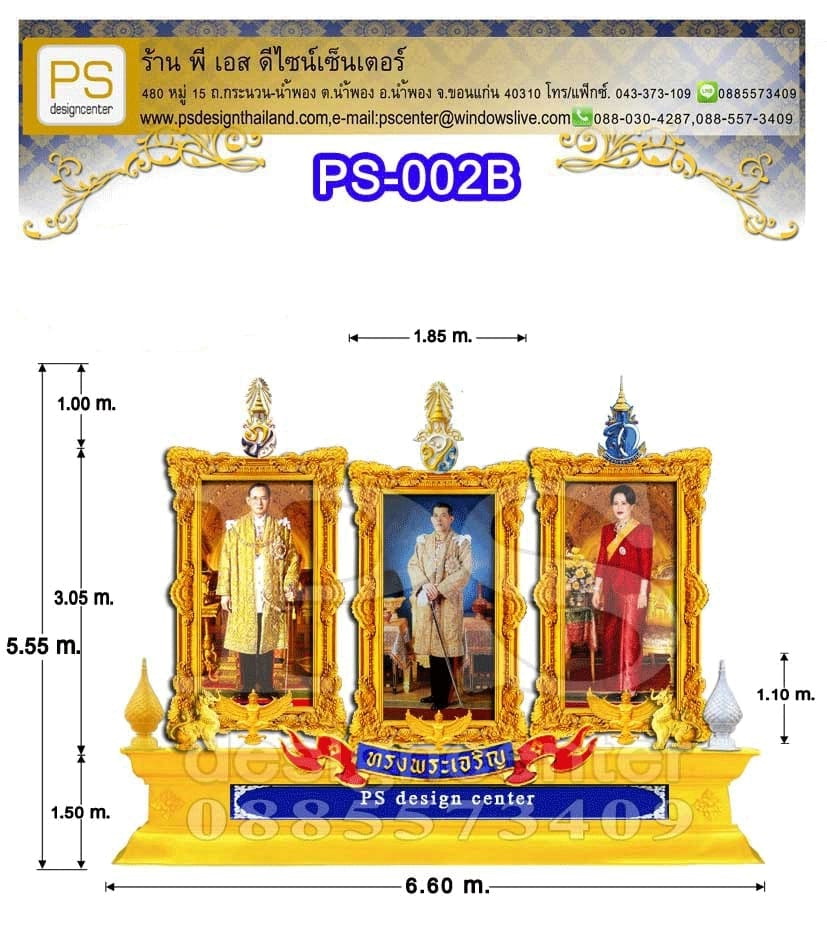 รหัสสินค้า : PS-002B ซุ้มเฉลิมพระเกียรติ ขนาด 6.60 x 5.55 เมตร. ประกอบด้วย *กรอบรูปไฟเบอร์กลาสขนาด 1.85 x 3.05 เมตร. *พระบรมฉายาลักษณ์ ขนาดพิมพ์ไวนิล ขนาด 1.20 x 2.40 เมตร. *ตราสัญลักษณ์ วปร. ภปร. สก. (กลาง) ขนาด 1.00 เมตร. *คชสิงห์ 1 คู่ ขนาด 0.55 x 0.70 เมตร *ครุฑไฟเบอร์กลาส ขนาด 0.60 เมตร. *ป้ายทรงพระเจริญไฟเบอร์กลาส ขนาด 0.38 x 3.80 เมตร. *ป้ายชื่อหน่วยงาน อักษรสติ๊กเกอร์ติดบนแผ่นซิ้งค์ ขนาด 0.40 x 1.80 เมตร *พานพุ่ม ไฟเบอร์กลาส เงิน-ทอง ขนาด 1.10 เมตร. *ฐานรองกรอบไฟเบอร์กลาส ขนาด 1.50 x 6.60 เมตร. *โครงเหล็กค้ำยันด้านหลัง สนใจติดต่อ 088-557-3409(คุณก้อย) ID LINE:0885573409 Email:pscenter@windowslive.com ขอใบเสนอราคา สำหรับผู้รับเหมาราคาพิเศษค่ะ เข้าชมผลงาน เราได้ที่เพจ https://www.facebook.com/PS-Design-Center-1495745454044165/ |
